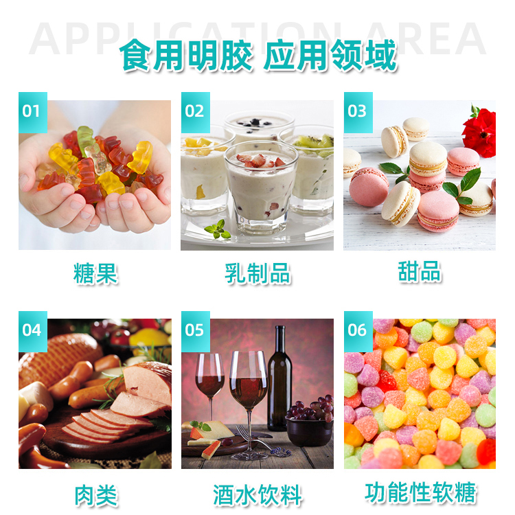 明膠具有獨特的熱可逆性凝膠能力,可在溫水中溶解,冷卻后成凝膠狀。由于其擁有凝膠、發(fā)泡、乳化和粘合等功能,明膠最常用于糖果、果凍等食品中。